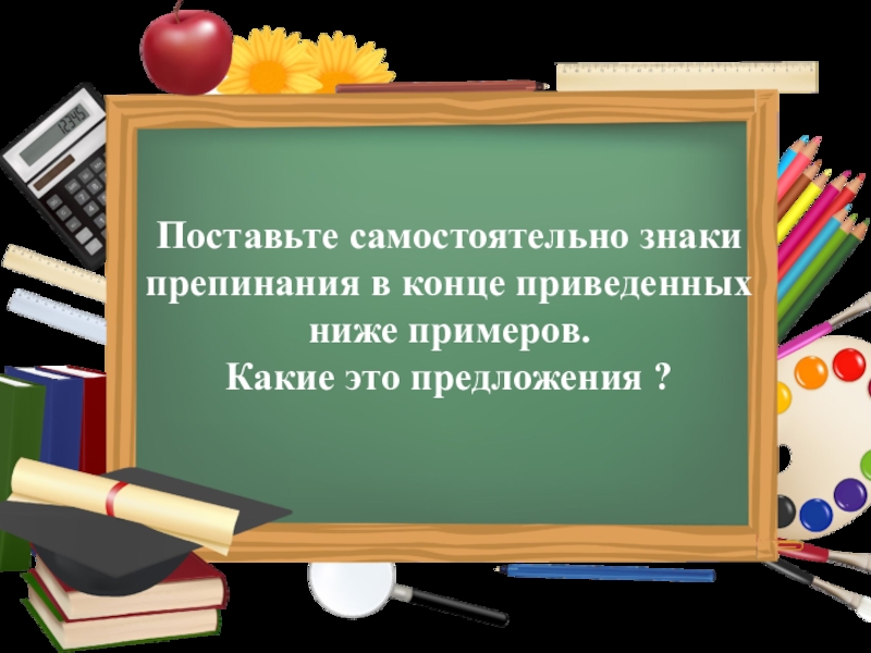 Слайд 11Поставьте самостоятельно знаки препинания в конце приведенных ниже примеров. Какие это
