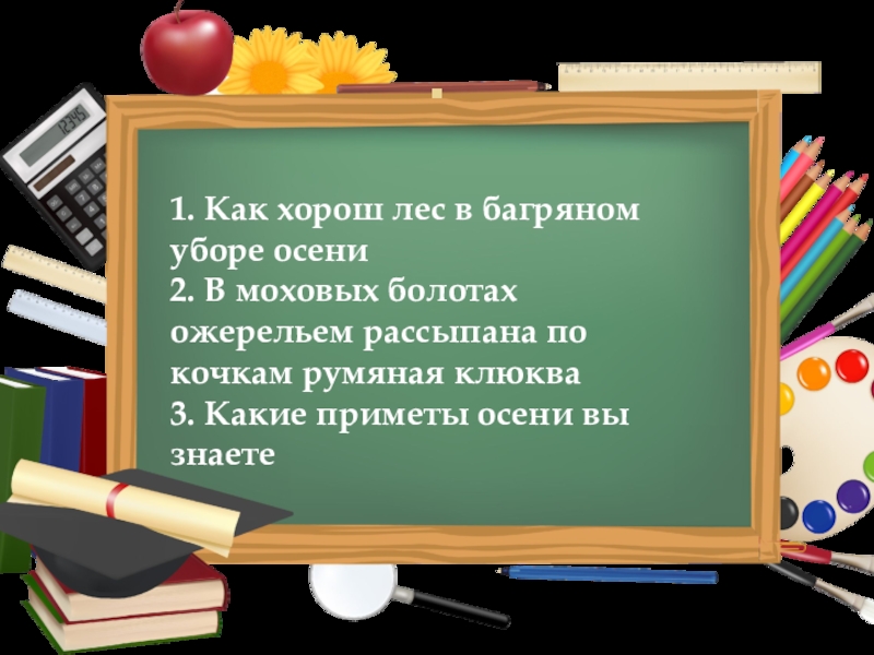 .1. Как хорош лес в багряном уборе осени 2. В моховых болотах ожерельем рассыпана по кочкам румяная