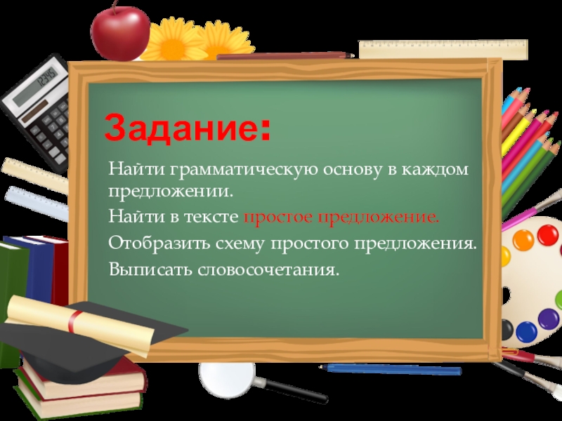 Задание:Найти грамматическую основу в каждом предложении.Найти в тексте простое предложение.Отобразить схему простого предложения.Выписать словосочетания.