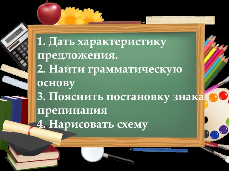 Слайд 71. Дать характеристику предложения. 2. Найти грамматическую основу 3. Пояснить постановку знака препинания 4.