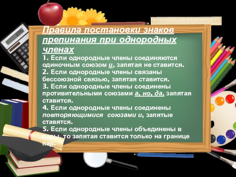 Слайд 9Правила постановки знаков препинания при однородных членах 1. Если однородные члены соединяются