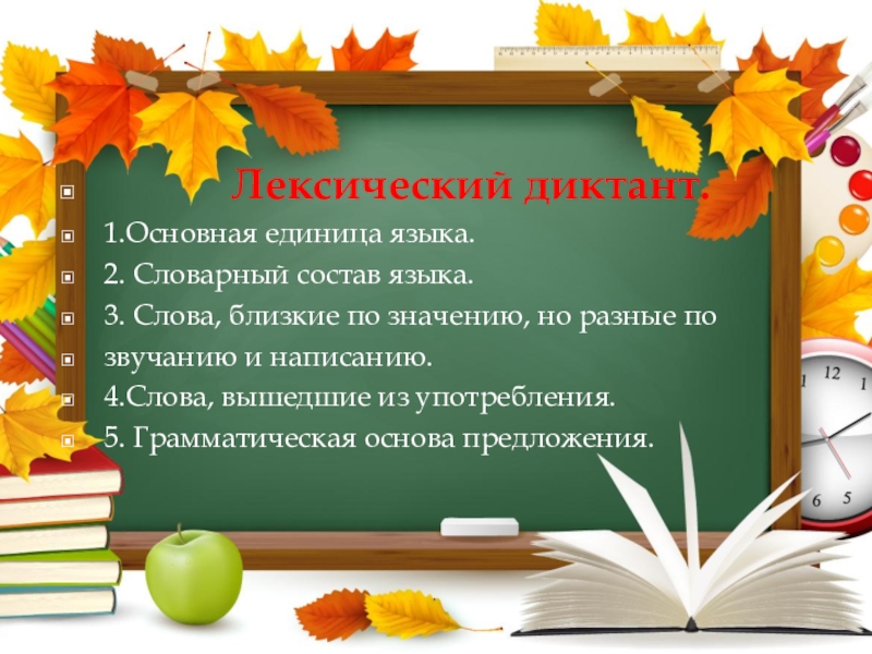Лексический диктант.1.Основная единица языка.2. Словарный состав языка.3. Слова, близкие