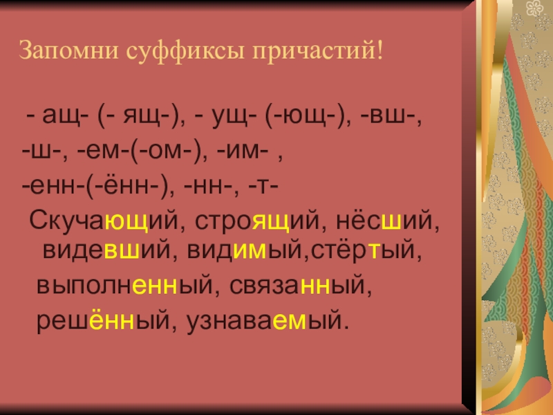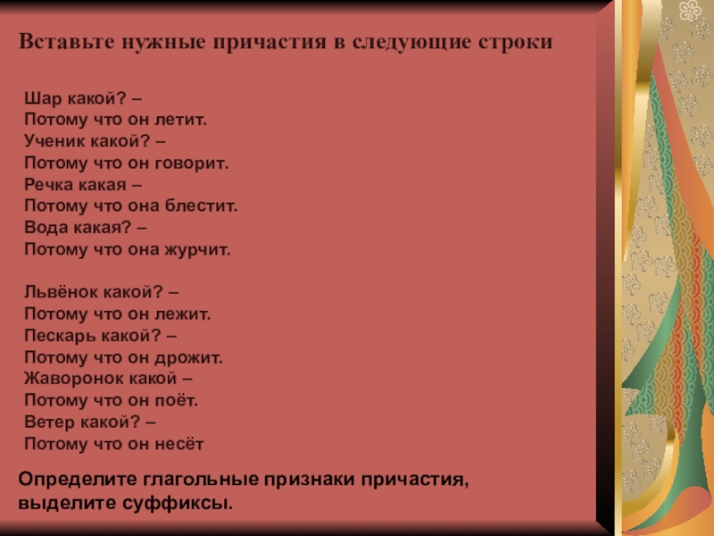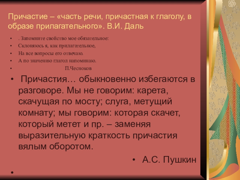 Причастия… обыкновенно избегаются в разговоре. Мы не говорим: карета, скачущая по мосту; слуга, метущий комнату; мы говорим: которая скачет, который метет и пр. – заменяя выразительную краткость причастия вялым оборотом.