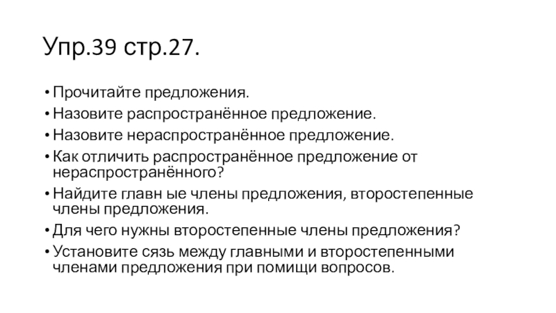 Упр.39 стр.27.Прочитайте предложения.Назовите распространённое предложение.Назовите нераспространённое предложение. Как отличить распространённое предложение от нераспространённого?Найдите главн ые члены предложения,