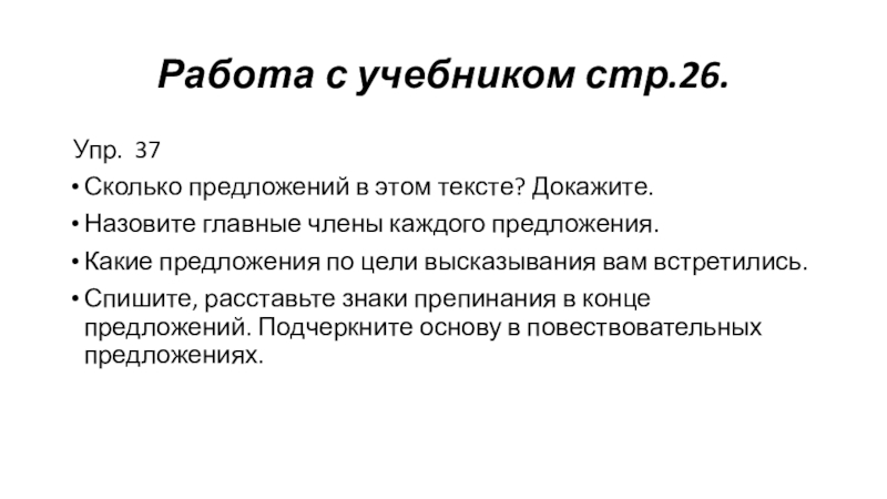 Работа с учебником стр.26. Упр. 37Сколько предложений в этом тексте? Докажите.Назовите главные члены каждого предложения.Какие предложения по