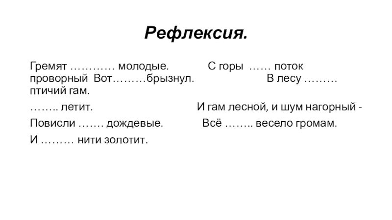 Рефлексия.Гремят ………… молодые.        С горы …… поток   проворный