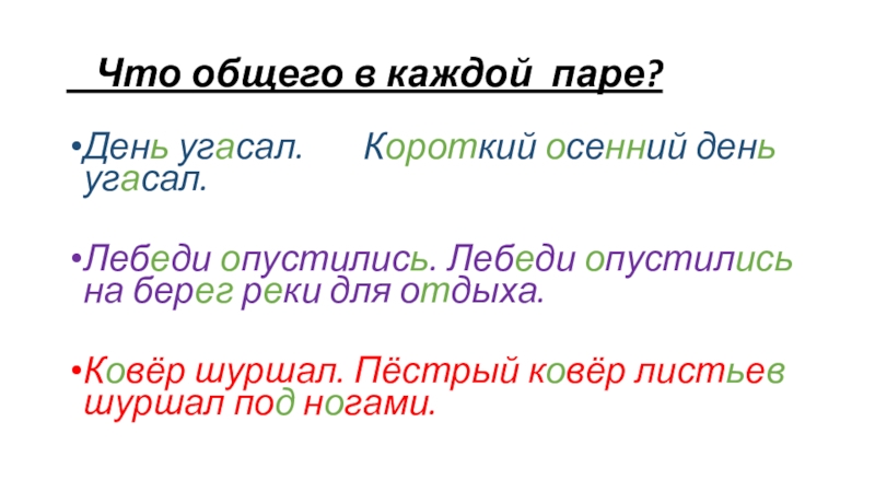 Что общего в каждой паре? День угасал.    Короткий осенний день угасал.Лебеди опустились.