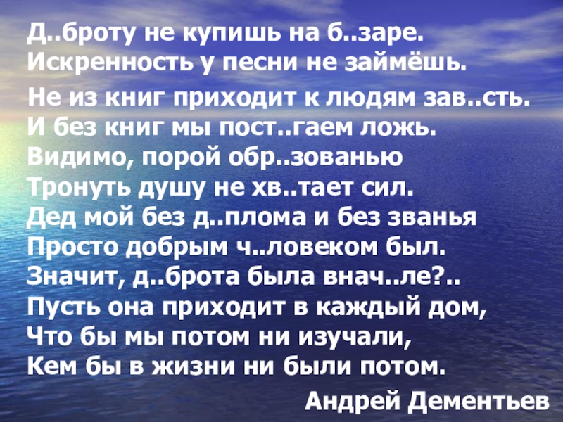 Не из книг приходит к людям зав..сть. И без книг мы пост..гаем ложь. Видимо, порой обр..зованью Тронуть душу не хв..тает сил. Дед мой без д..плома и без званья Просто добрым ч..ловеком был. Значит, д..брота была внач..ле?.. Пусть она приходит в каждый дом, Что бы мы потом ни изучали, Кем бы в жизни ни были потом.