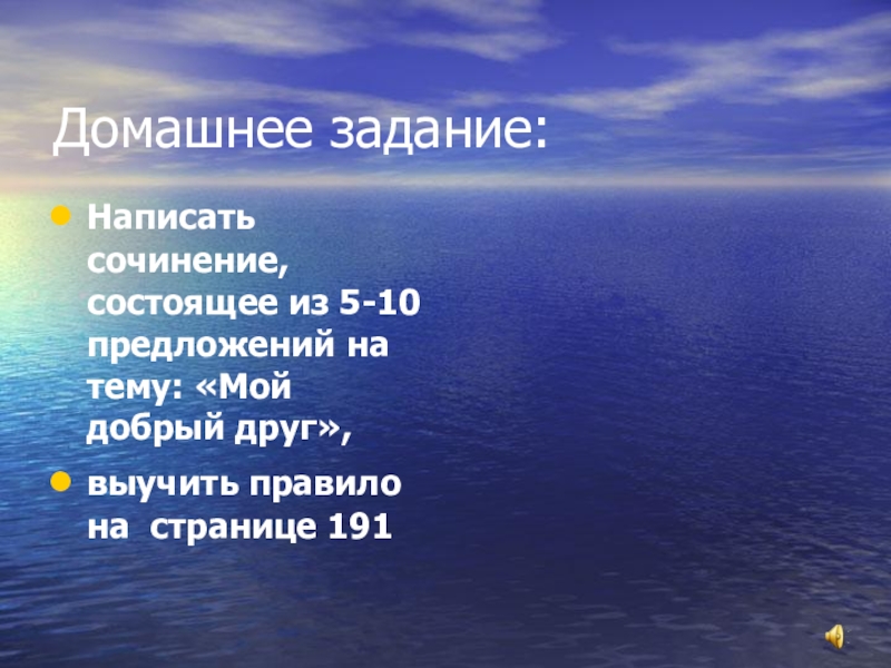 Домашнее задание:Написать сочинение, состоящее из 5-10 предложений на тему: «Мой добрый друг»,выучить правило на странице 191