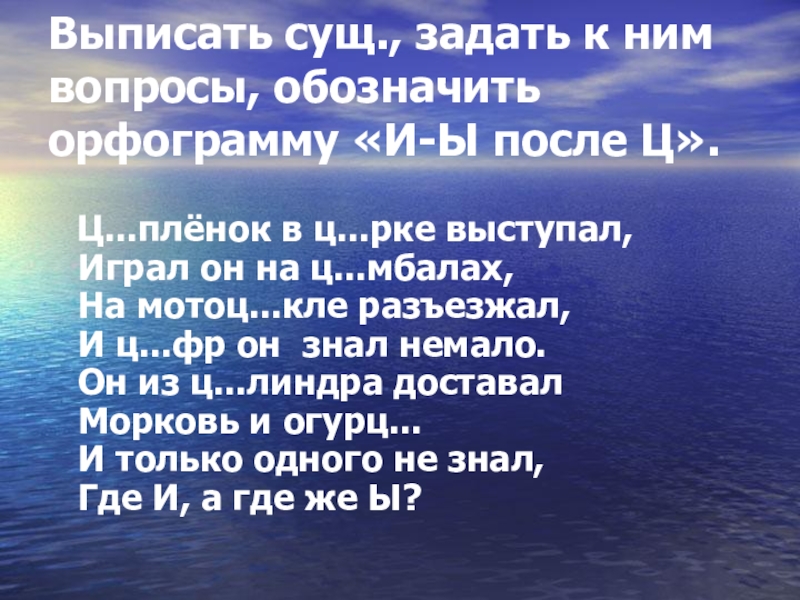 Ц...плёнок в ц...рке выступал, Играл он на ц...мбалах, На мотоц...кле разъезжал, И ц...фр он знал немало. Он из ц...линдра доставал Морковь и огурц... И только одного не знал, Где И, а где же Ы?