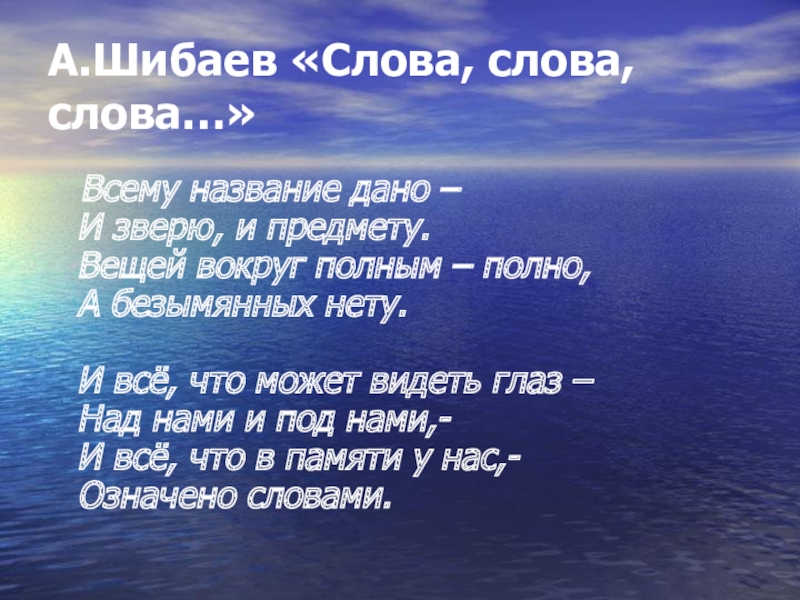 А.Шибаев «Слова, слова, слова…»  Всему название дано – И зверю, и предмету. Вещей вокруг полным –