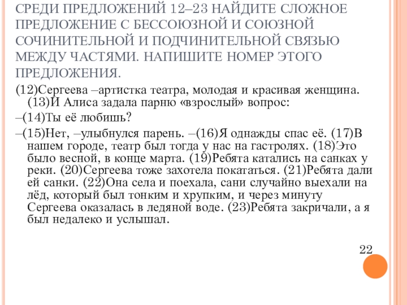 –(15)Нет, –улыбнулся парень. –(16)Я однажды спас её. (17)В нашем городе, театр был тогда у нас на гастролях. (18)Это было весной, в конце марта. (19)Ребята катались на санках у реки. (20)Сергеева тоже захотела покататься. (21)Ребята дали ей санки. (22)Она села и поехала, сани случайно выехали на лёд, который был тонким и хрупким, и через минуту Сергеева оказалась в ледяной воде. (23)Ребята закричали, а я был недалеко и услышал.