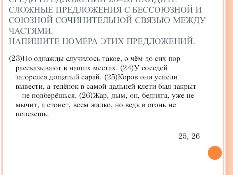 (23)Но однажды случилось такое, о чём до сих пор рассказывают в наших местах. (24)У соседей загорелся дощатый сарай. (25)Коров они успели вывести, а телёнок в самой дальней клети был закрыт – не подберёшься. (26)Жар, дым, он, бедняга, уже не мычит, а стонет, всем жалко, но ведь в огонь не полезешь.