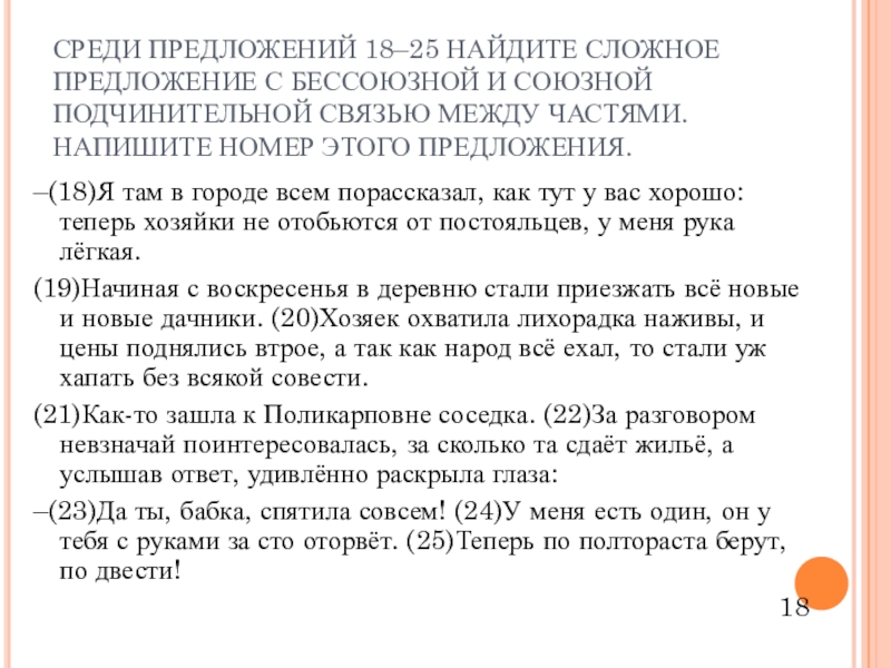 (21)Как-то зашла к Поликарповне соседка. (22)За разговором невзначай поинтересовалась, за сколько та сдаёт жильё, а услышав ответ, удивлённо раскрыла глаза: