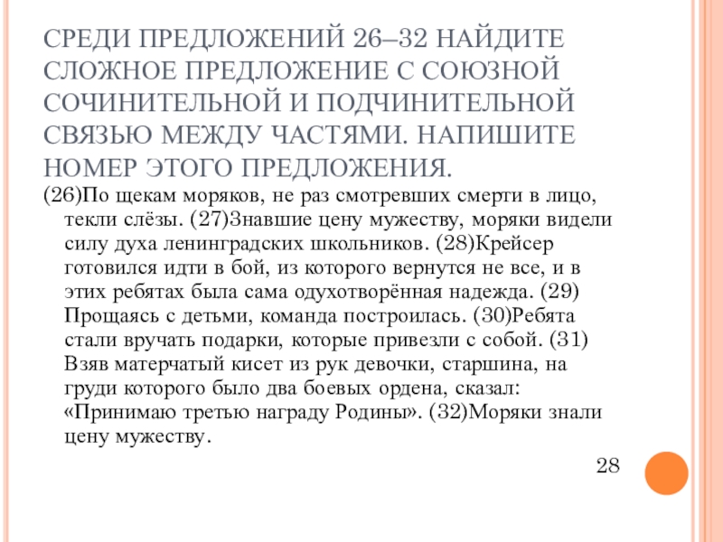 (26)По щекам моряков, не раз смотревших смерти в лицо, текли слёзы. (27)3навшие цену мужеству, моряки видели силу духа ленинградских школьников. (28)Крейсер готовился идти в бой, из которого вернутся не все, и в этих ребятах была сама одухотворённая надежда. (29)Прощаясь с детьми, команда построилась. (30)Ребята стали вручать подарки, которые привезли с собой. (31)Взяв матерчатый кисет из рук девочки, старшина, на груди которого было два боевых ордена, сказал: «Принимаю третью награду Родины». (32)Моряки знали цену мужеству.
