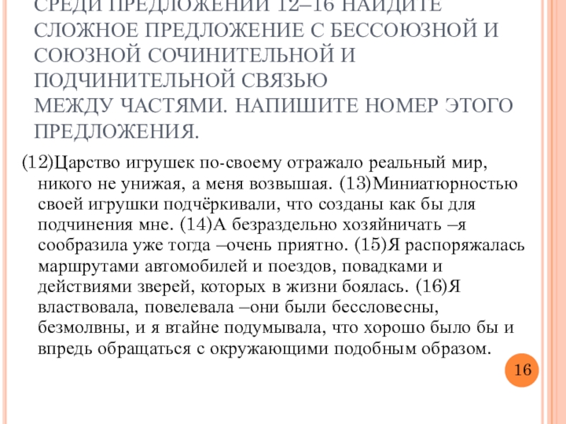 (12)Царство игрушек по-своему отражало реальный мир, никого не унижая, а меня возвышая. (13)Миниатюрностью своей игрушки подчёркивали, что созданы как бы для подчинения мне. (14)А безраздельно хозяйничать –я сообразила уже тогда –очень приятно. (15)Я распоряжалась маршрутами автомобилей и поездов, повадками и действиями зверей, которых в жизни боялась. (16)Я властвовала, повелевала –они были бессловесны, безмолвны, и я втайне подумывала, что хорошо было бы и впредь обращаться с окружающими подобным образом.