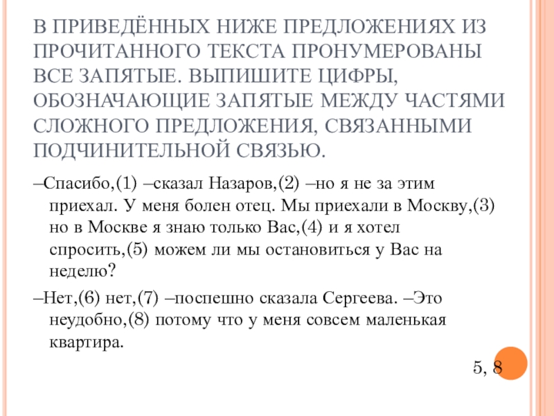 –Спасибо,(1) –сказал Назаров,(2) –но я не за этим приехал. У меня болен отец. Мы приехали в Москву,(3) но в Москве я знаю только Вас,(4) и я хотел спросить,(5) можем ли мы остановиться у Вас на неделю?