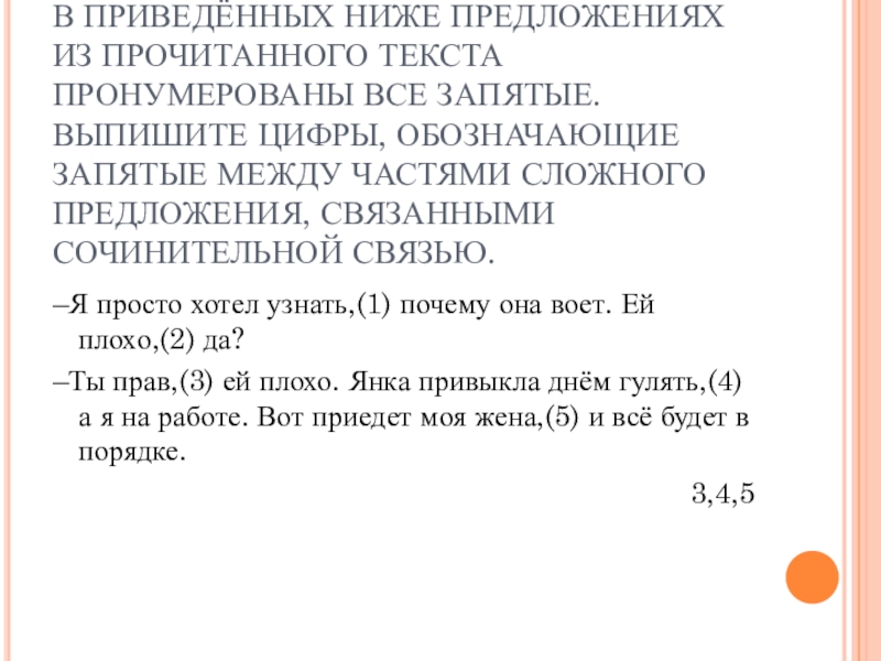 –Ты прав,(3) ей плохо. Янка привыкла днём гулять,(4) а я на работе. Вот приедет моя жена,(5) и всё будет в порядке.