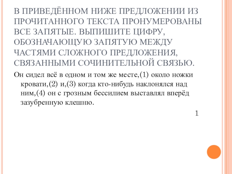 Он сидел всё в одном и том же месте,(1) около ножки кровати,(2) и,(3) когда кто-нибудь наклонялся над ним,(4) он с грозным бессилием выставлял вперёд зазубренную клешню.