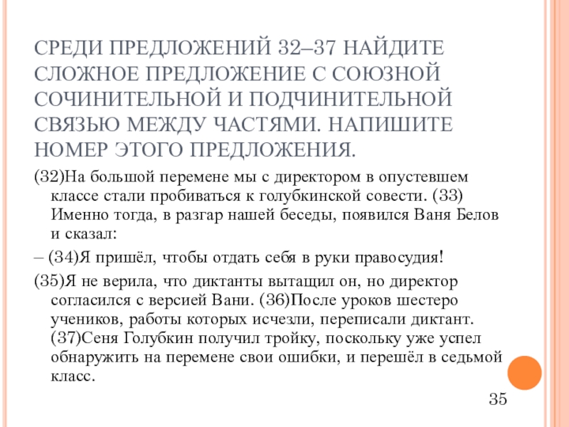 (35)Я не верила, что диктанты вытащил он, но директор согласился с версией Вани. (36)После уроков шестеро учеников, работы которых исчезли, переписали диктант. (37)Сеня Голубкин получил тройку, поскольку уже успел обнаружить на перемене свои ошибки, и перешёл в седьмой класс.