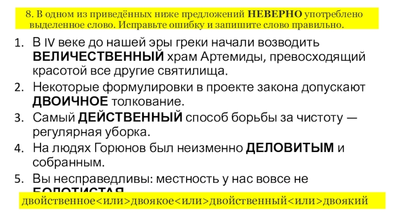 8. В одном из приведённых ниже предложений НЕВЕРНО употреблено выделенное слово. Исправьте ошибку и запишите слово правильно.