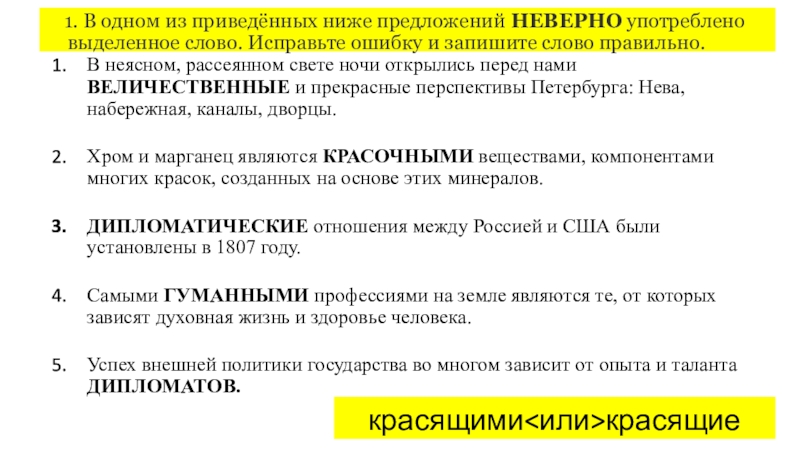 1. В одном из приведённых ниже предложений НЕВЕРНО употреблено выделенное слово. Исправьте ошибку и запишите слово правильно.