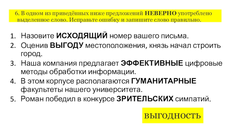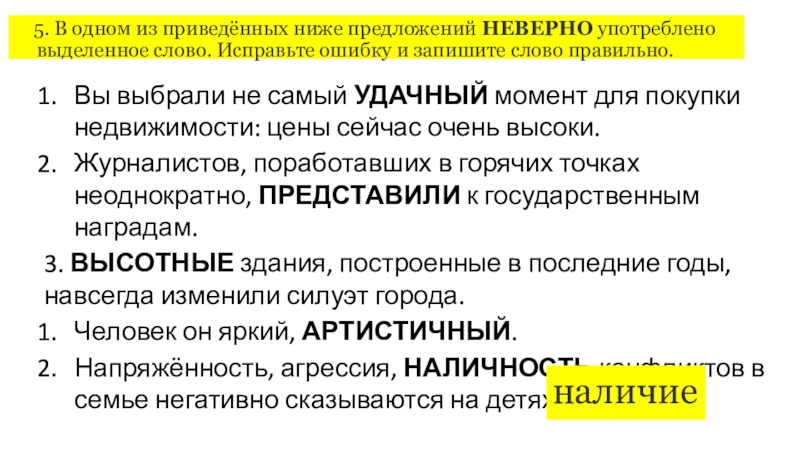 5. В одном из приведённых ниже предложений НЕВЕРНО употреблено выделенное слово. Исправьте ошибку и запишите слово правильно.