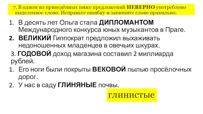 7. В одном из приведённых ниже предложений НЕВЕРНО употреблено выделенное слово. Исправьте ошибку и запишите слово правильно.