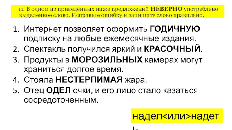 11. В одном из приведённых ниже предложений НЕВЕРНО употреблено выделенное слово. Исправьте ошибку и запишите слово правильно.