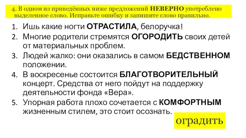 4. В одном из приведённых ниже предложений НЕВЕРНО употреблено выделенное слово. Исправьте ошибку и запишите слово правильно.