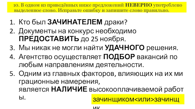 10. В одном из приведённых ниже предложений НЕВЕРНО употреблено выделенное слово. Исправьте ошибку и запишите слово правильно.