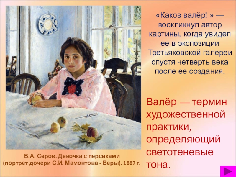 «Каков валёр! » — воскликнул автор картины, когда увидел ее в экспозиции Третьяковской галереи спустя четверть века после ее создания.