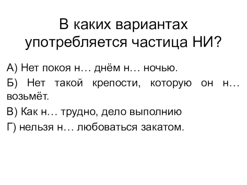 Слайд 7В каких вариантах употребляется частица НИ?