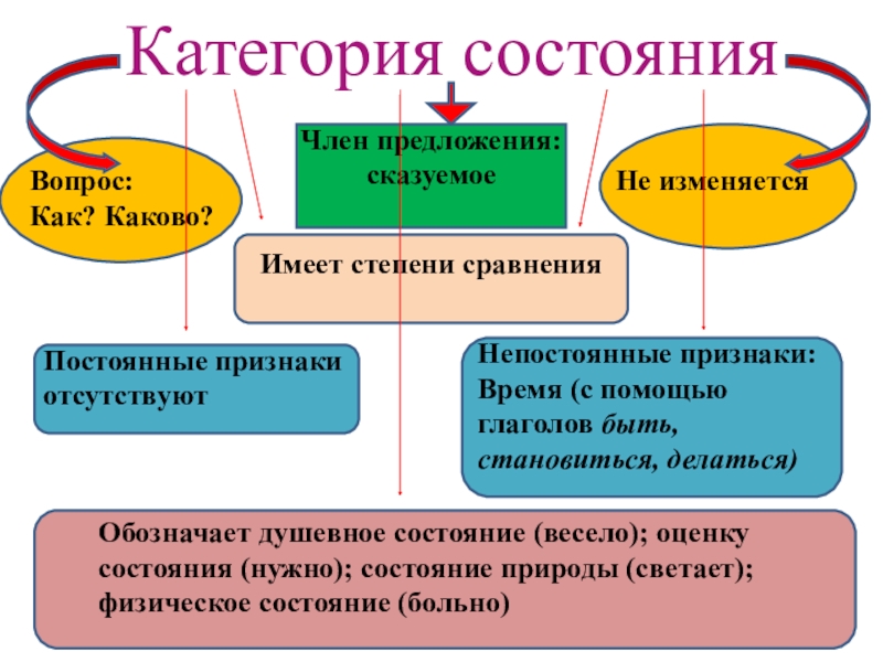 Обозначает душевное состояние (весело); оценку состояния (нужно); состояние природы (светает); физическое состояние (больно)