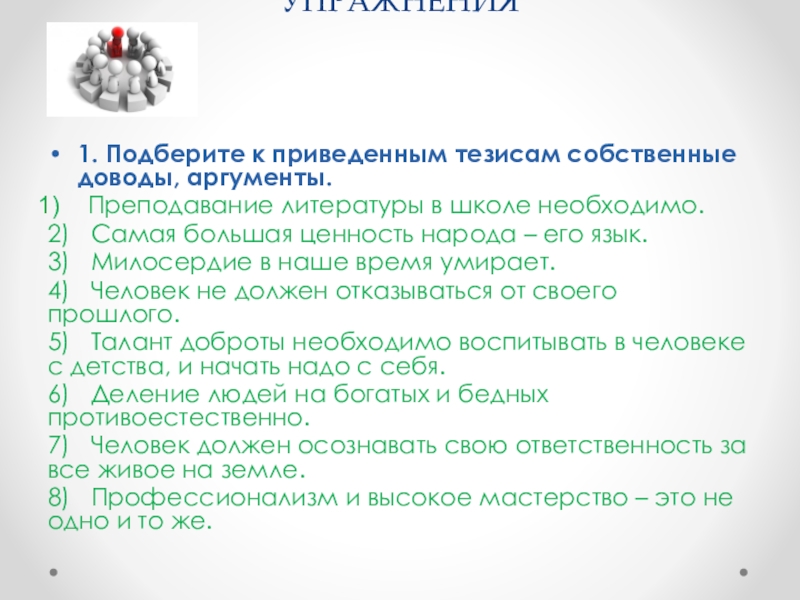 1. Подберите к приведенным тезисам собственные доводы, аргументы.