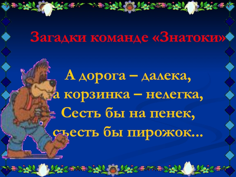 Загадки команде «Знатоки»А дорога – далека, а корзинка – нелегка,Сесть бы на пенек, съесть бы пирожок...