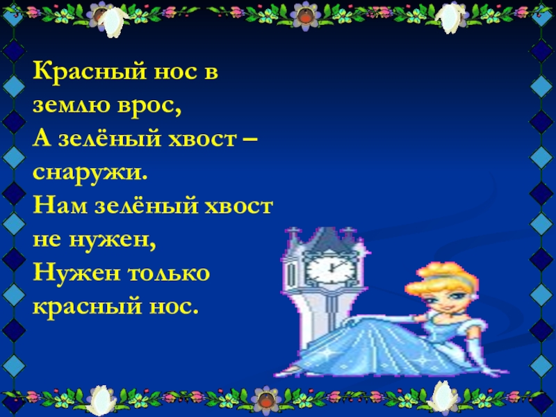 Слайд 6Красный нос в землю врос, А зелёный хвост – снаружи. Нам зелёный