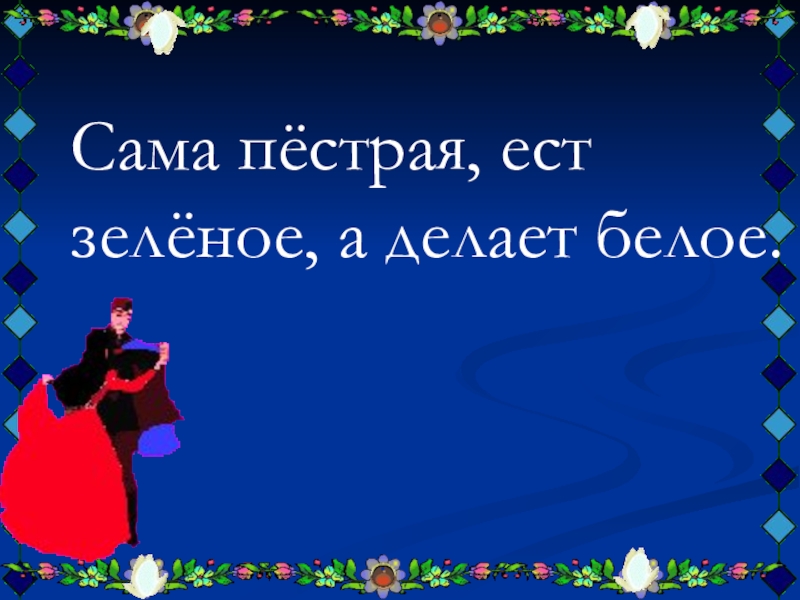 Слайд 8Сама пёстрая, ест зелёное, а делает белое.