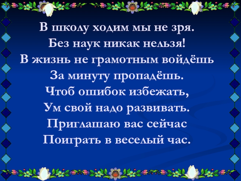 В школу ходим мы не зря. Без наук никак нельзя! В жизнь не грамотным войдёшь За минуту пропадёшь. Чтоб ошибок избежать, Ум свой надо развивать. Приглашаю вас сейчас Поиграть в веселый час.