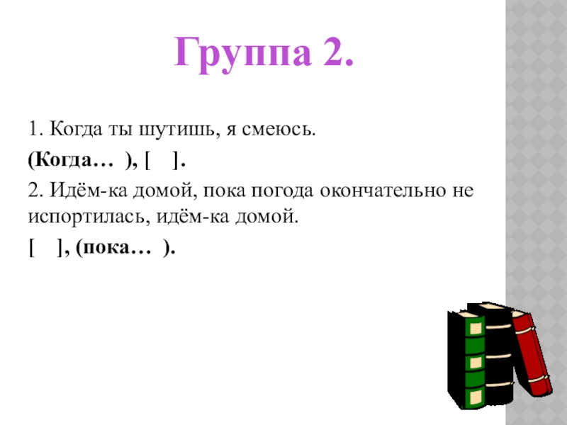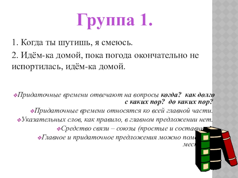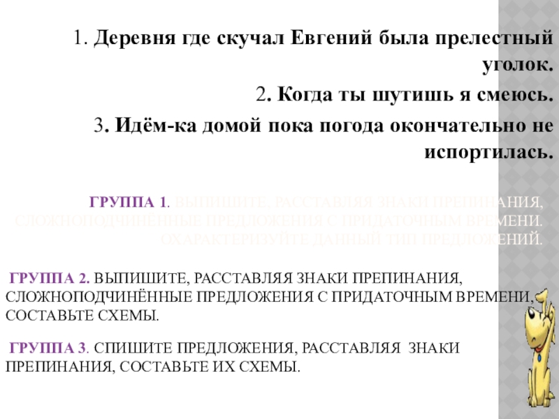 ГРУППА 2. ВЫПИШИТЕ, РАССТАВЛЯЯ ЗНАКИ ПРЕПИНАНИЯ, СЛОЖНОПОДЧИНЁННЫЕ ПРЕДЛОЖЕНИЯ С ПРИДАТОЧНЫМ ВРЕМЕНИ, СОСТАВЬТЕ СХЕМЫ.