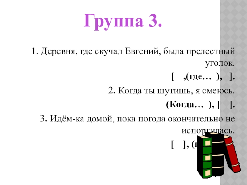 ГРУППА 3. СПИШИТЕ ПРЕДЛОЖЕНИЯ, РАССТАВЛЯЯ ЗНАКИ ПРЕПИНАНИЯ, СОСТАВЬТЕ ИХ СХЕМЫ.