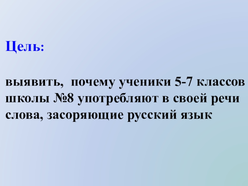 Цель:  выявить, почему ученики 5-7 классов  школы №8 употребляют в своей речи слова, засоряющие русский