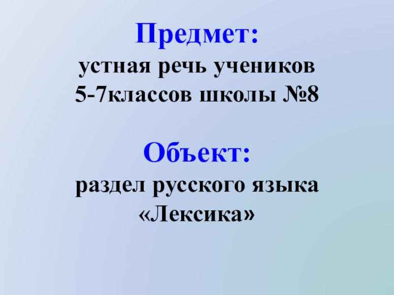 Слайд 4 Предмет: устная речь учеников 5-7классов школы №8 Объект: раздел русского языка «Лексика»