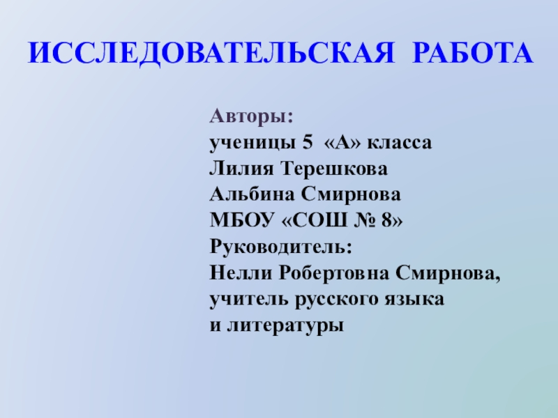 ИССЛЕДОВАТЕЛЬСКАЯ РАБОТААвторы: ученицы 5 «А» классаЛилия ТерешковаАльбина СмирноваМБОУ «СОШ № 8»Руководитель: Нелли Робертовна Смирнова, учитель русского языка