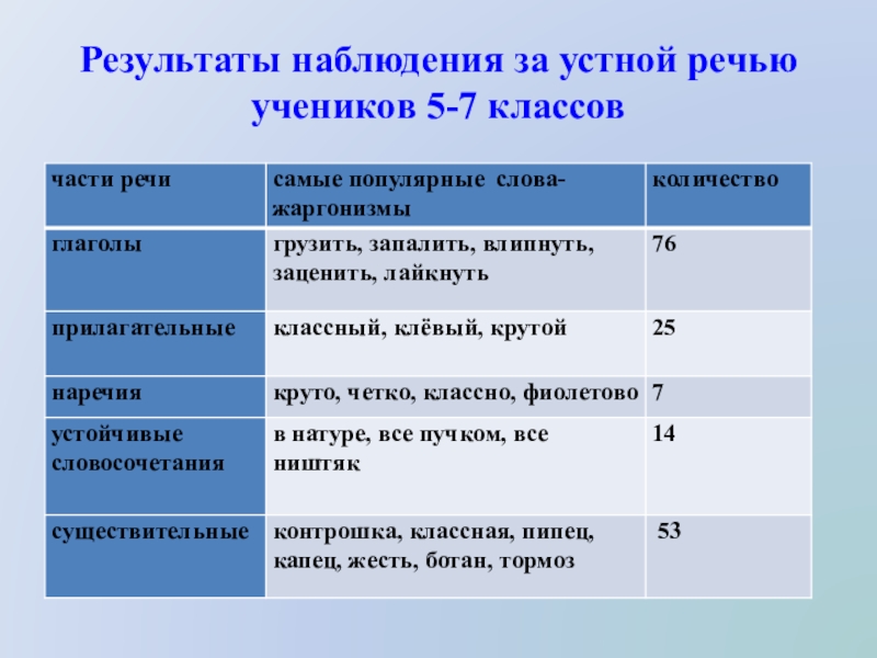 Слайд 5Результаты наблюдения за устной речью учеников 5-7 классов