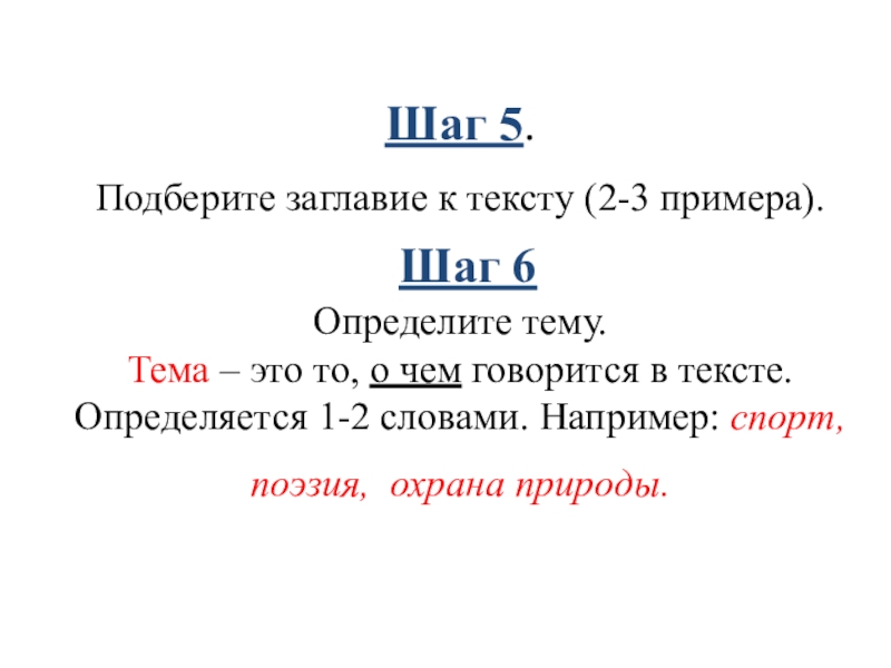 Тема – это то, о чем говорится в тексте. Определяется 1-2 словами. Например: спорт, поэзия, охрана природы.