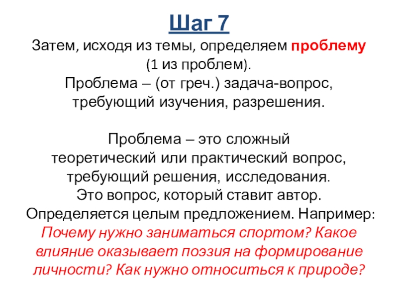 Это вопрос, который ставит автор. Определяется целым предложением. Например: Почему нужно заниматься спортом? Какое влияние оказывает поэзия на формирование личности? Как нужно относиться к природе?