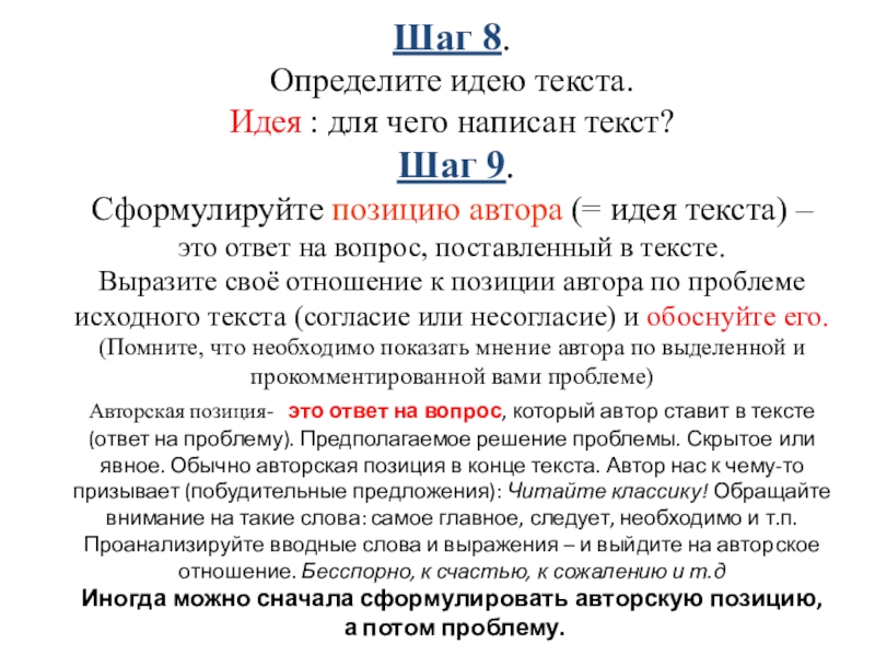 Авторская позиция- это ответ на вопрос, который автор ставит в тексте (ответ на проблему). Предполагаемое решение проблемы. Скрытое или явное. Обычно авторская позиция в конце текста. Автор нас к чему-то призывает (побудительные предложения): Читайте классику! Обращайте внимание на такие слова: самое главное, следует, необходимо и т.п. Проанализируйте вводные слова и выражения – и выйдите на авторское отношение. Бесспорно, к счастью, к сожалению и т.д