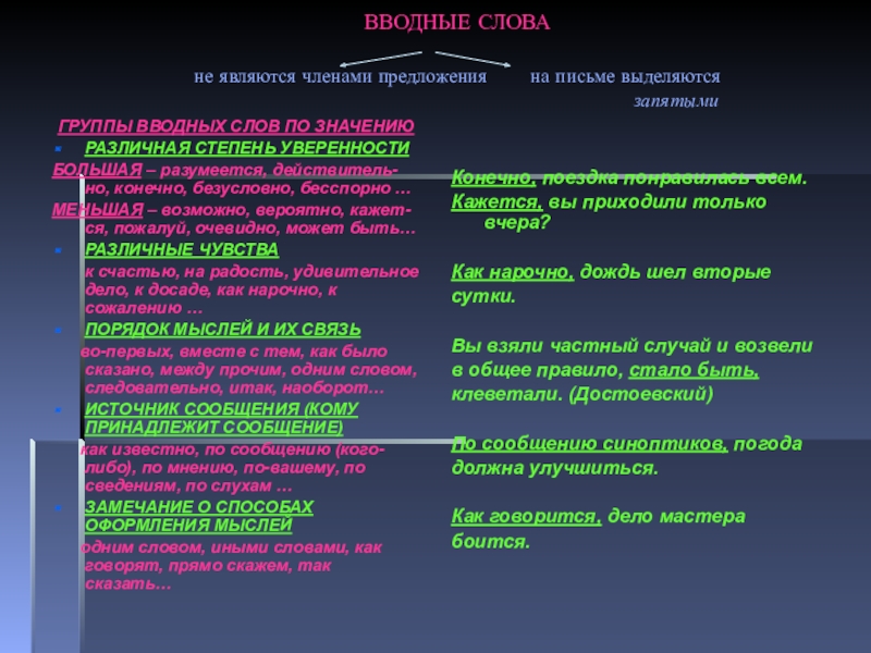 ГРУППЫ ВВОДНЫХ СЛОВ ПО ЗНАЧЕНИЮ