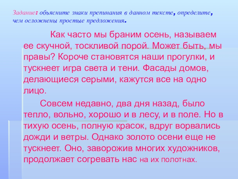 Совсем недавно, два дня назад, было тепло, вольно, хорошо и в лесу, и в поле. Но в тихую осень, полную красок, вдруг ворвались дожди и ветры. Однако золото осени еще не тускнеет. Оно, заворожив многих художников, продолжает согревать нас на их полотнах.